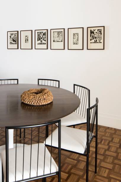 Como a moradora adora design brasileiro, as arquitetas investiram em alguns móveis assinados: “Compramos a luminária de piso Arco de Castiglioni, que é de segunda mão. A mesa lateral do sofá é uma parte de uma estante de Jorge Zalszupin que garimpamos em um antiquário, as cadeiras de jantar de Geraldo de Barros e a Moleca, de Sergio Rodrigues, era um sonho da cliente. No escritório temos também a cadeira LC7 da Charlotte Perriand, outra peça bacana, e o carrinho de chá do Jader Almeida“.