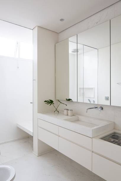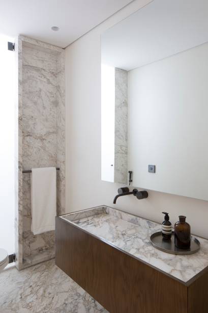 “O apartamento tinha uma suíte e dois dormitórios que dividem um banheiro – um usado como escritório e o outro para receber os sobrinhos que dormem lá algumas vezes. Por conta disso, a moradora optou por um banheiro a mais que dividisse o uso entre receber sobrinhos para dormir e, ao mesmo tempo, ser bonito para receber as visitas e ter cara de lavabo“, contam as arquitetas.