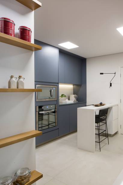 Como o taquinho era uma característica marcante do apê, as arquitetas tiraram proveito dele para fazer uma marcenaria com o mesmo tom, assim destacando-o e contrabalanceando-o com paredes brancas e uma estante leve.