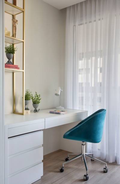 De forma geral, a paleta de cores vibra em tons neutros. Como a moradora não gosta de cinza, a arquiteta substituiu por bege em nuances variadas, pontuando com rosé em alguns detalhes. “A ideia foi criar ambientes claros e neutros para transmitir tranquilidade e convidar ao descanso”, explica Camila.