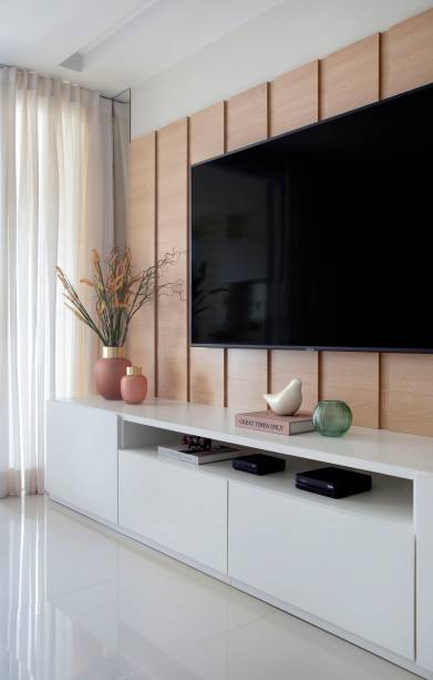 A pedido da moradora, uma atmosfera clean foi explorada por Camila, que incluiu poucos móveis na decoração. A arquiteta preferiu investir em uma boa marcenaria sob medida, com acabamento em madeira clara, além de espelhos em pontos estratégicos do apartamento para aumentar a sensação de amplitude e luminosidade nos espaços.