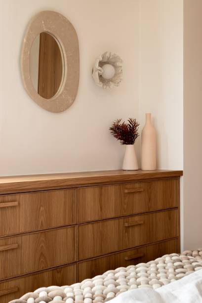 Outro ponto que chama a atenção é a cabeceira em marcenaria, que se integra ao restante do ambiente.