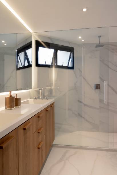 Bancada de banheiro vira espelho neste apê de 234 m²