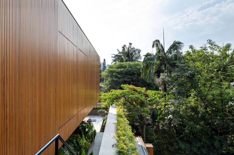 Já no andar superior, outro volume forrado de madeira envolve o home office, com painéis que oferecem a abertura total para as salas do térreo. Uma cobertura ajardinada acima do bloco social complementa as áreas de convivência e lazer, dialogando com o entorno e proporcionando uma vista privilegiada do bairro.