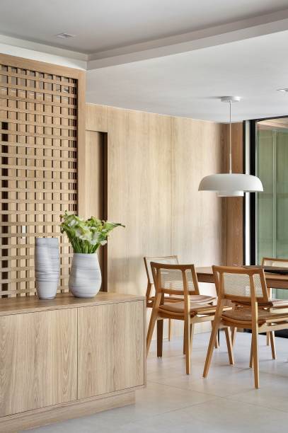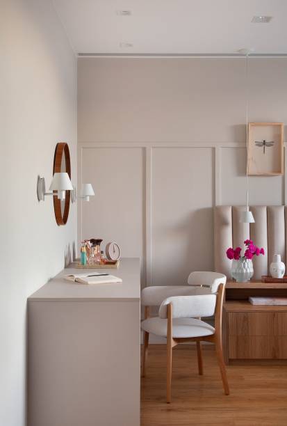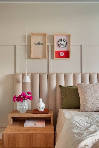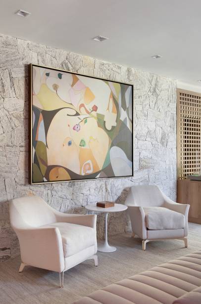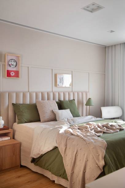 Na decoração, os ambientes tem uma base neutra e clara, com pontos de cor nos adornos e obras de arte. Para deixar os espaços mais calorosos e acolhedores, as marcenarias ganharam acabamentos em madeira, com acréscimo da cor verde oliva nos armários da cozinha, e algumas paredes da sala foram revestidas em pedra.