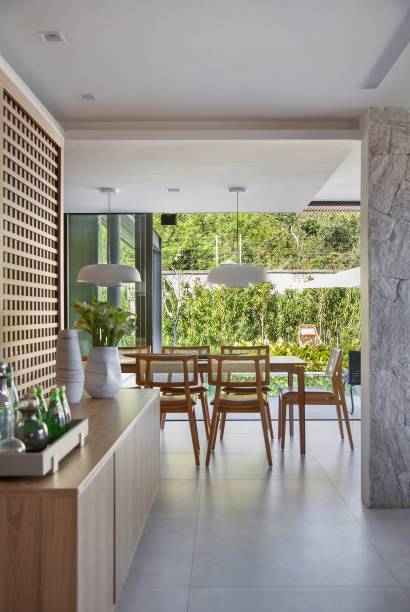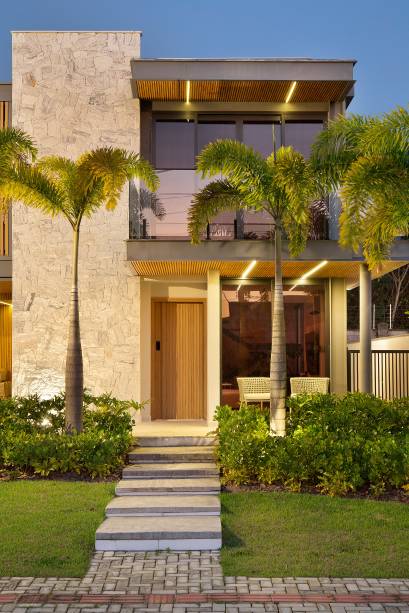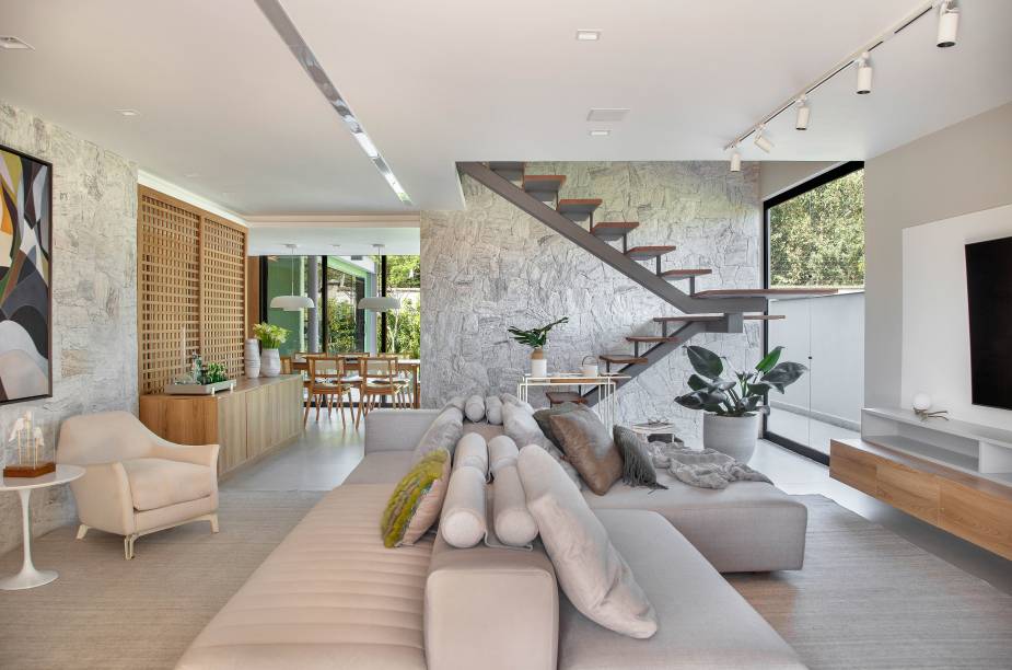 No geral, o conceito do projeto buscou trazer elementos da área externa, incluindo o paisagismo, para dentro da casa e, para isso, contou com a integração dos ambientes do andar térreo como principal aliado. O campo de visão de quem entra na casa, por exemplo, “percorre” todo o setor social até alcançar a área da piscina, que fica nos fundos do terreno.