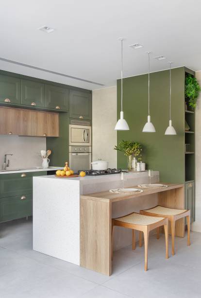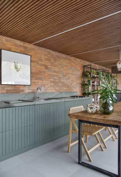 Casa de 300 m² tem cozinha verde oliva e área gourmet em contêiner