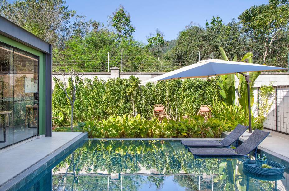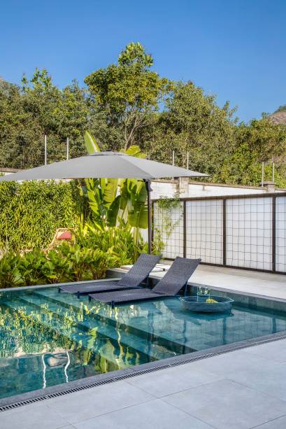 Na área externa, o espaço gourmet, instalado dentro de um contêiner, com o lado maior totalmente envidraçado e voltado para a piscina, tem uma história bastante curiosa: ele foi exposto na CASACOR Pernambuco, em 2020, e trazido para o Rio, especialmente para fazer parte do projeto.