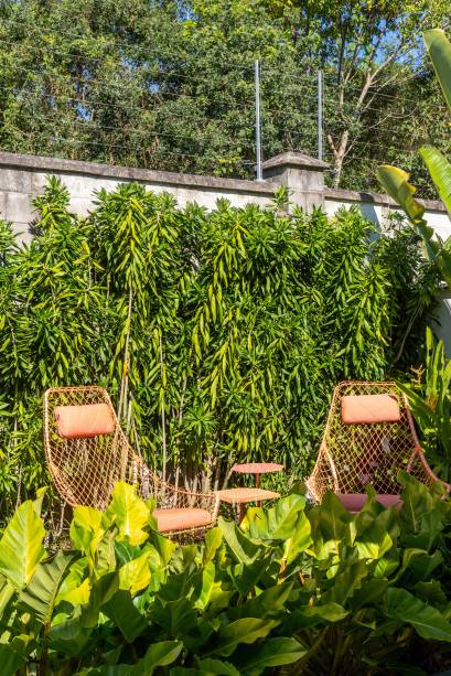 “Nos ambientes internos, me pediram um projeto com decoração atemporal e funcional, além de uma cozinha na cor verde oliva. Já na área externa, solicitaram um jardim tropical, de fácil manutenção, que abraçasse a casa”, conta a designer.