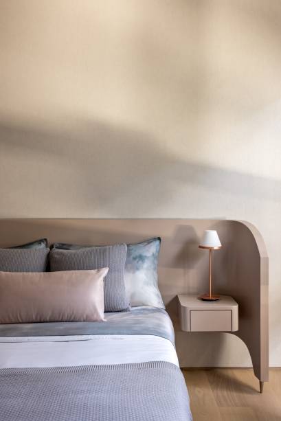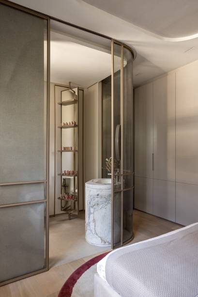 Para a suíte master, eles criaram uma setorização importante, separando a área de descanso das demais. A área de closet foi reformulada a fim de prover o máximo aproveitamento para o morador.