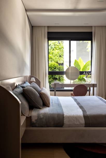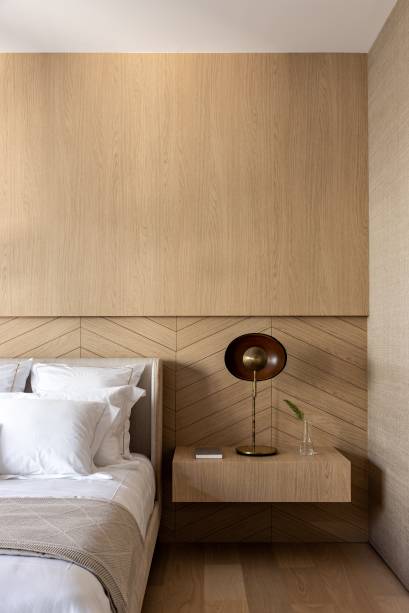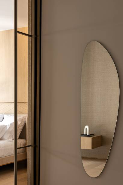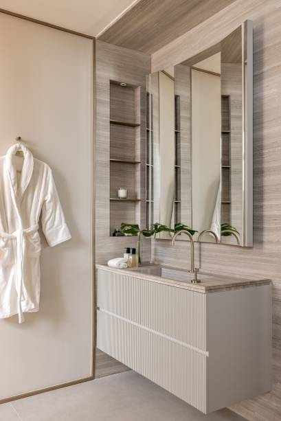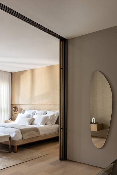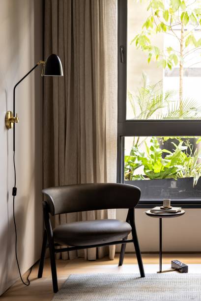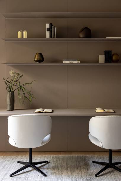 “Na área íntima, criamos ambientes onde o morador se conecta com a sua essência. Para o home office, pensamos em um ambiente mais monocromático, com parede revestida em couro, para as horas mais introspectivas”, explicam os arquitetos.