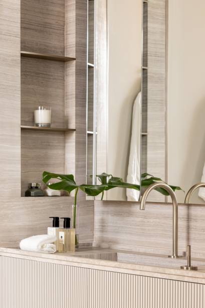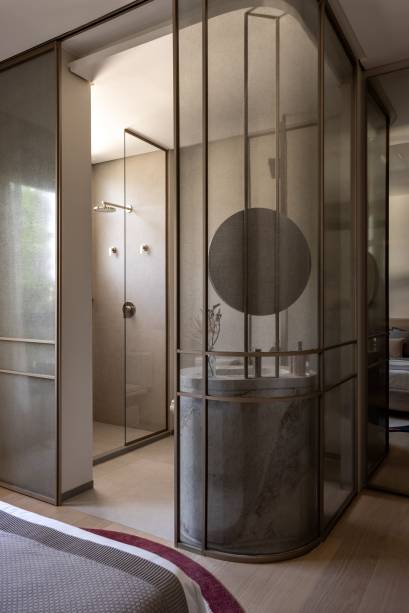 Enquanto isso, a disposição do layout do banheiro master, com uma banheira central, proporciona a sensação de um verdadeiro spa. Aqui, diferentes texturas e acabamentos foram aplicados criando um interior extremamente elegante e rico.