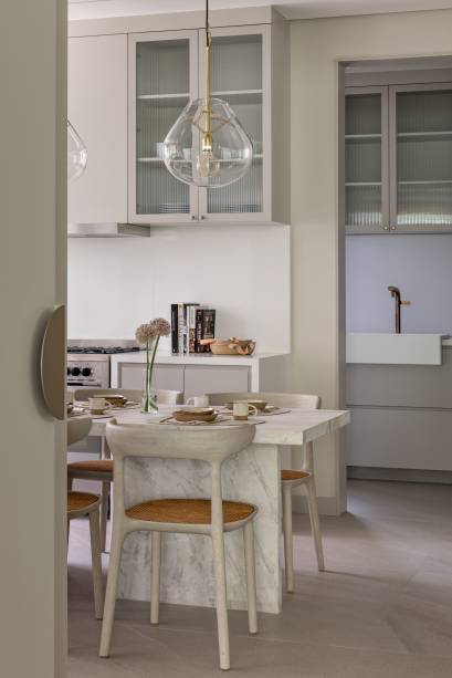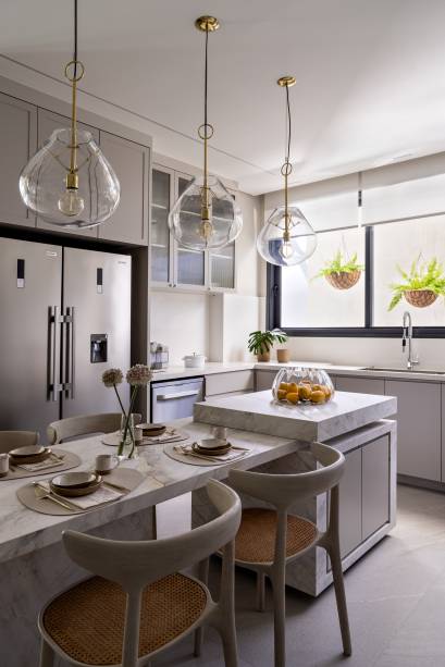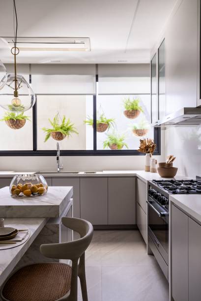 Já living, com o sofá modular central, tem seu layout totalmente integrado à área de convivência. A cozinha, por sua vez, foi inspirada nas casas de fazenda e convida para momentos mais íntimos e familiares, com o aconchego das cadeiras de assento em palha.