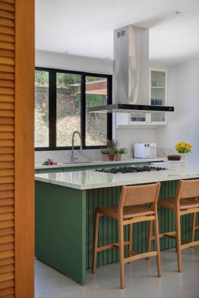A cozinha foi pensada especialmente para a cliente, que ama cozinhar: ela é totalmente aberta para a sala de jantar e dispõe de uma ilha central, onde as pessoas podem se acomodar e interagir durante o preparo das refeições.