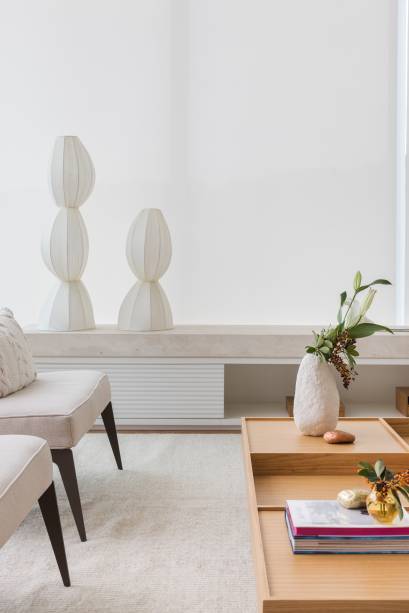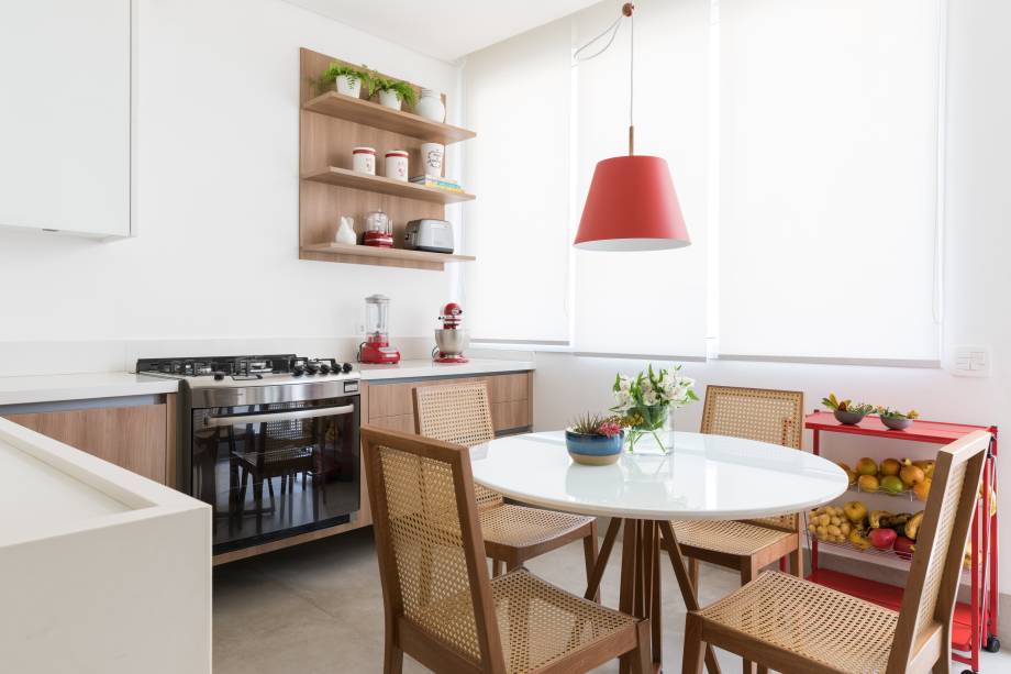 A decoração segue uma linha clean, com paleta de cores claras e bastante marcenaria planejada. Tons mais vibrantes aparecem pontualmente em móveis como o aparador, o lustre e a estante de livros. Todos os cômodos são banhados com a luz natural das janelas.
