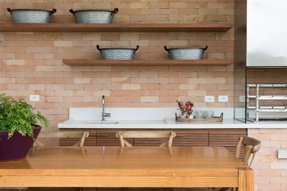 Na área gourmet merecem destaque a mesa e cadeiras em madeira e a parede de tijolinhos.