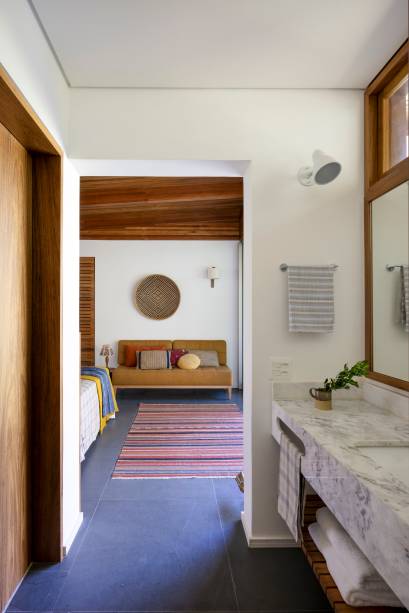 Já os itens de decoração, entre tapetes, tecidos, quadros e objetos, são do acervo pessoal da família. Nos banheiros, as arquitetas também usaram materiais tradicionais e simples, com destaque para as bancadas em mármore branco nacional e a área do chuveiro, que foi revestida com pastilhas brancas, de 5x5cm.
