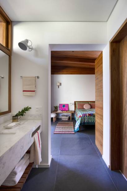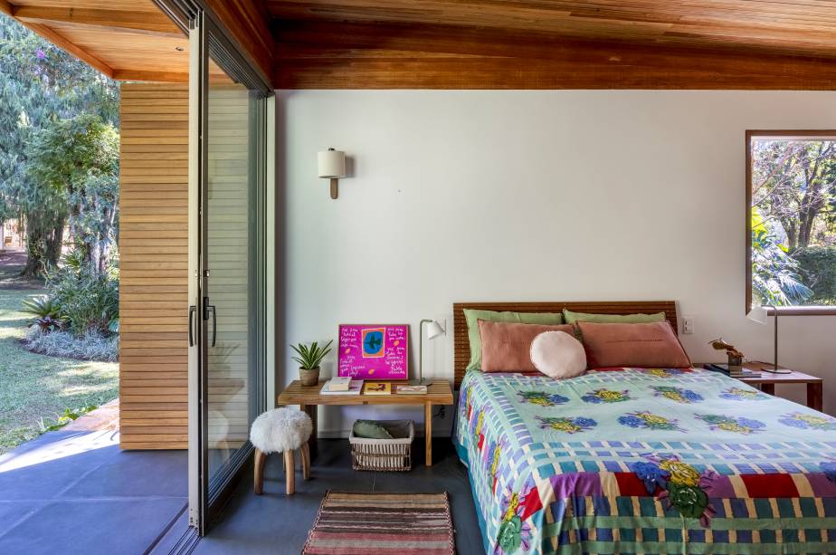 “Além do desejo de ter mais espaço para receber confortavelmente os amigos e a família composta por dois filhos casados e cinco netos, eles também queriam que o teto fosse forrado com madeira de demolição. Arrematamos um lote generoso de lambri de peroba-do-campo e usamos a sobra do material para fazer boa parte dos armários e a cabeceira da cama de um dos quartos”, conta a arquiteta.