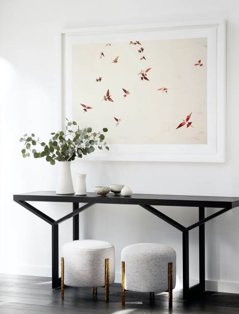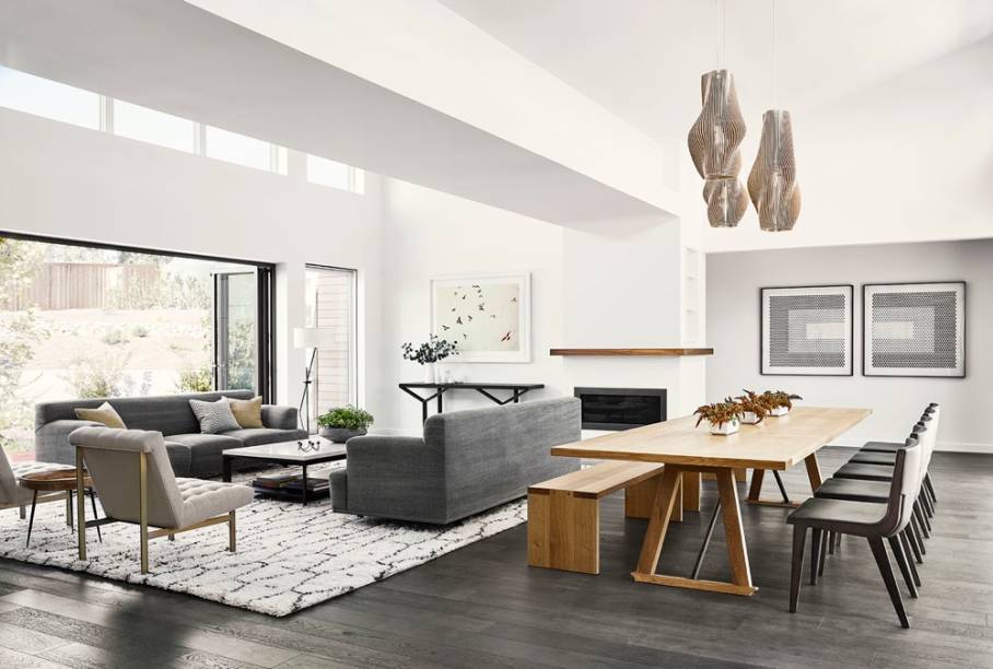 O mobiliário mistura formas inspiradas em meados do século, com peças contemporâneas para criar ambientes descontraídos e informais. Tapetes e tecidos conferem texturas e peças de madeira feitas à mão aquecem os espaços, criando um belo cenário para as obras de arte contemporânea do casal.