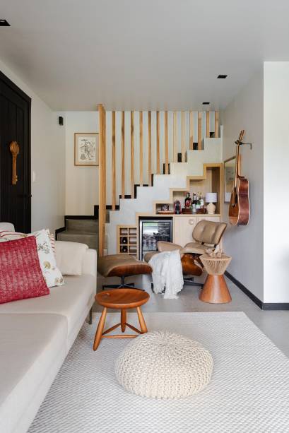 A composição do mobiliário conta ainda com móveis de área externa da Tidelli e mesa, cadeiras e sofá da sala de estar da Domi Interiores. Já a poltrona Charles Eames, o aparador da cozinha, o sofá da sala de TV e o conjunto de cabeceira e mesa de apoio, da suíte principal, são do acervo do casal.