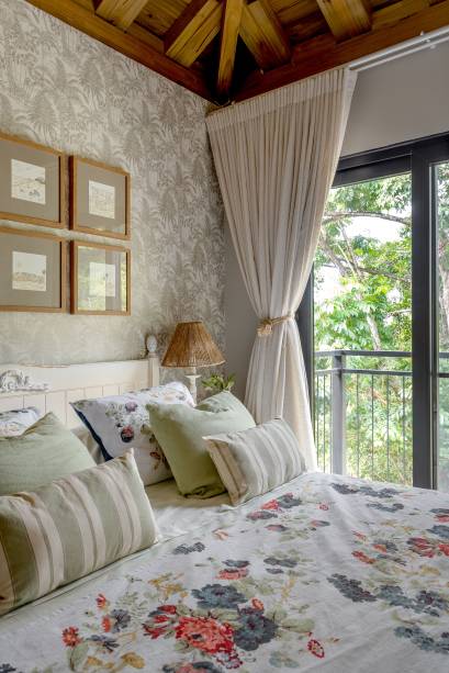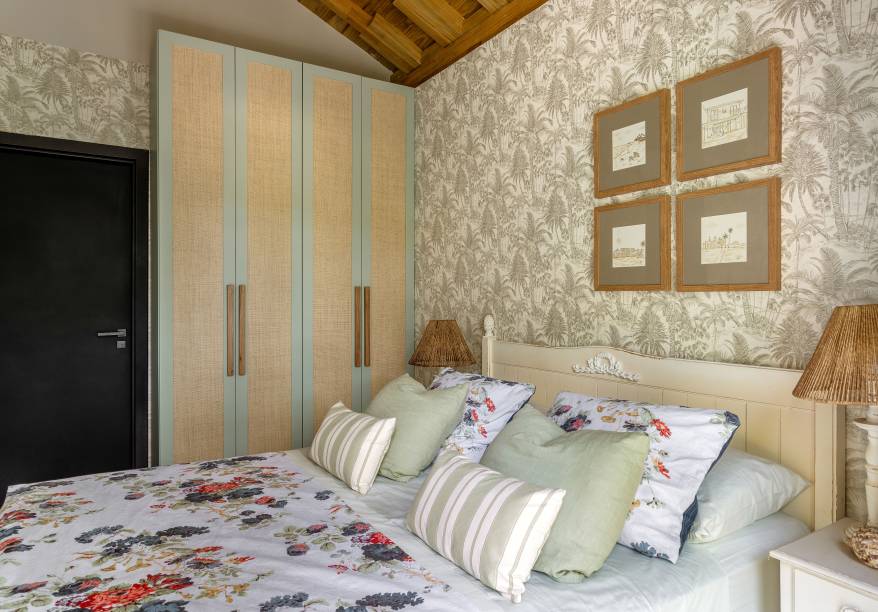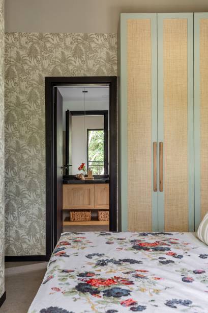 A fachada na cor azul, padrão do condomínio, foi o ponto de partida para o mix de matizes adotado pela arquiteta, buscando imprimir autenticidade e aconchego aos ambientes. “Ao contrário do meu apartamento em Salvador, que é bem neutro, queria uma casa de praia com cores e estampas. A cor predominante nos interiores foi o verde, presente no papel de parede dos quartos, para trazer a mata para dentro. Já nos armários da área gourmet adotei o tom marsala, criando um contraste com o azul da fachada e combinando com nossos pratos decorativos – compramos um prato em cada cidade que passamos na lua de mel, na Costa Amalfitana”, revela Juliana.