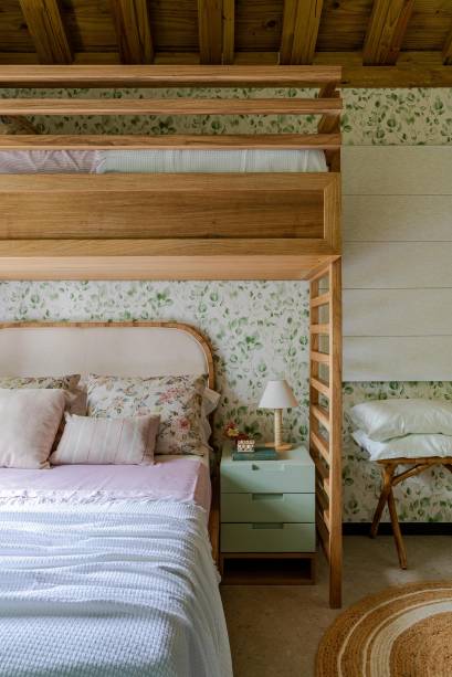 Para trazer um ar de praia contemporâneo despojado para a morada, Juliana apostou em texturas como madeira, sisal, palha e tecidos naturais, presentes em móveis e acessórios. A marcenaria em louro freijó, desenhada pela arquiteta e executada pela MN Armários, é um dos destaques do projeto – é o caso do beliche das filhas, feito em madeira maciça.