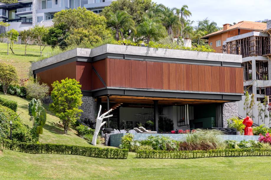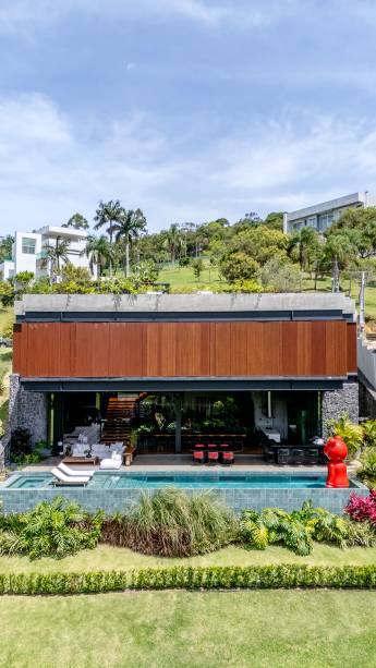 A sustentabilidade permeia todo o projeto, começando pela escolha de materiais e técnicas construtivas modernas, como a estrutura metálica e o telhado verde, que garante que a casa se mantenha naturalmente fresca, reduzindo a temperatura em até 10 graus durante o verão. “Sustentabilidade não é apenas colocar uma placa solar no teto”, afirma o proprietário. O telhado verde, de 450 m², por exemplo, é um espaço natural e multifuncional, onde a família pratica atividades físicas e curte momentos de aconchego junto ao fireplace.