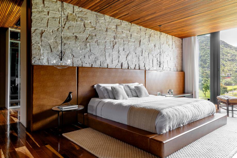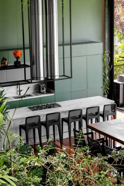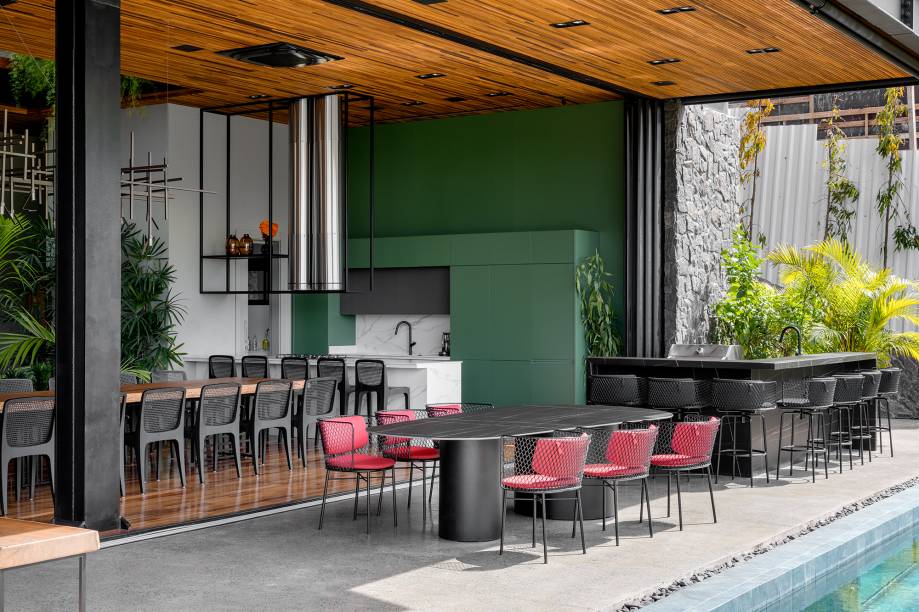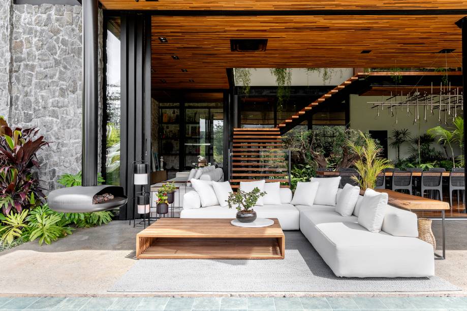 Outro destaque é a área gourmet, onde a família recebe seus convidados com frequência. No espaço, a churrasqueira e a mesa para 20 pessoas, com cadeiras assinadas pelo designer brasileiro Jader Almeida, compõem um ambiente acolhedor e integrado ao jardim interno. O ambiente ganha ainda mais elegância e estilo com o imponente lustre de ferro, assinado pelo designer Roni Brunner, exclusivamente para a morada. Ressaltando o design tupiniquim, o projeto também conta com duas poltronas Sergio Rodrigues, que harmonizam com o conceito natural da casa.