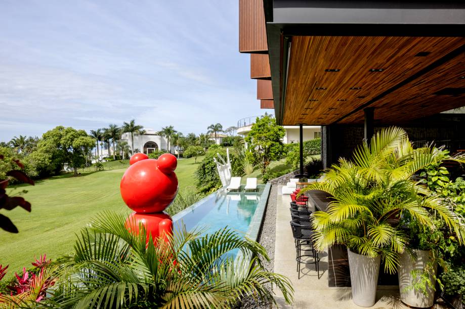 A casa conta também com uma ampla área gourmet com churrasqueira e a mesa para 20 pessoas. Dentro da piscina há uma Toy Art PNDA de 4m altura.