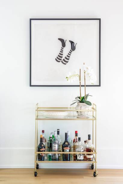 Os elementos fundamentais da sala de estar foram mantidos bastante neutros, com os móveis feitos sob medida adicionando a quantidade certa de cor para preencher a lacuna entre os brancos neutros e os tons brilhantes do tapete. O amor dos clientes pela moda é ainda representado pelos desenhos a carvão pendurados nas paredes.