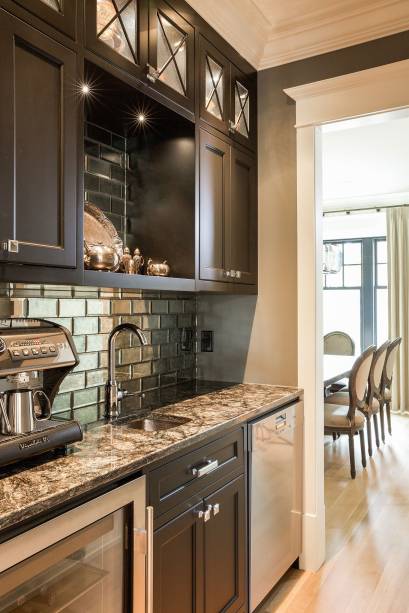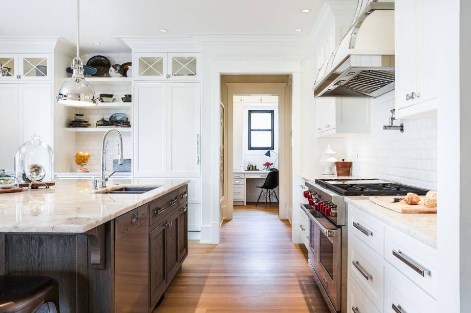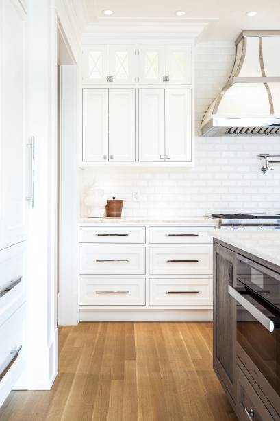 A maioria dos eletrodomésticos são revestidos e integrados para manter uma aparência perfeita, enquanto o backsplash de ladrilhos subway feito à mão e chanfrado adiciona textura ao espaço. O exaustor de capô feito sob medida foi projetado com um acabamento prateado para amarrar os detalhes de níquel da cozinha.