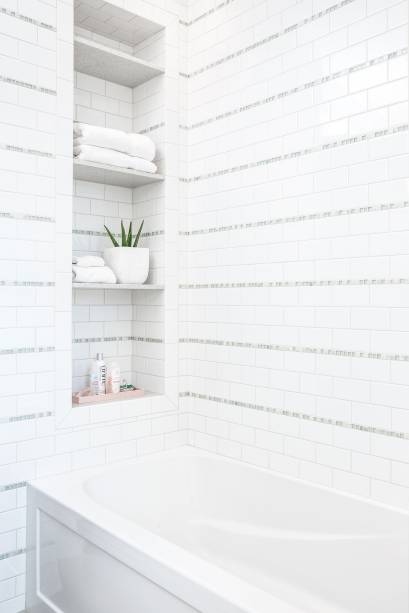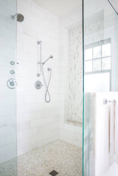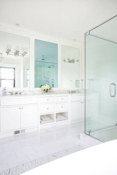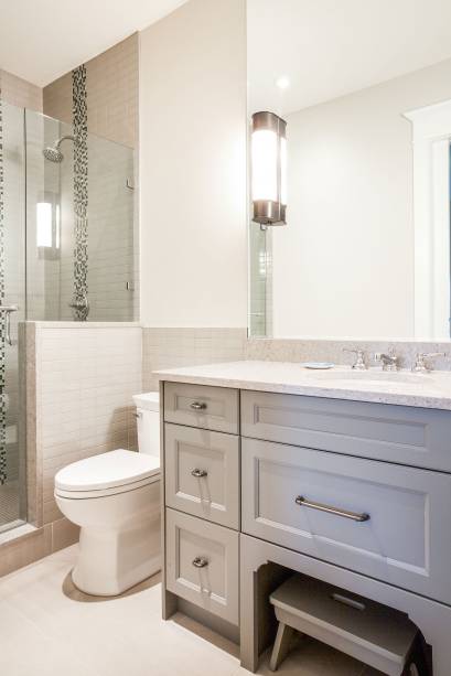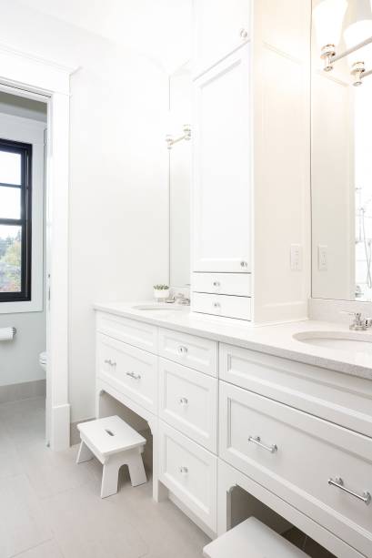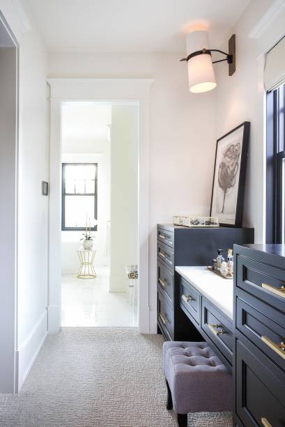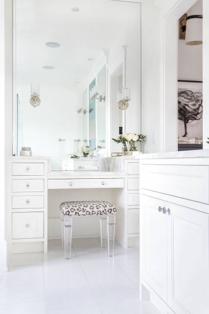 No banheiro principal, não querendo sacrificar a abundância de luz natural, foi instalada uma película fosca na janela em vez de cortinas. A luz natural é perfeita para a aplicação de maquiagem, por isso foi incluída uma penteadeira de maquiagem para que a cliente pudesse ter seu próprio espaço para se arrumar.