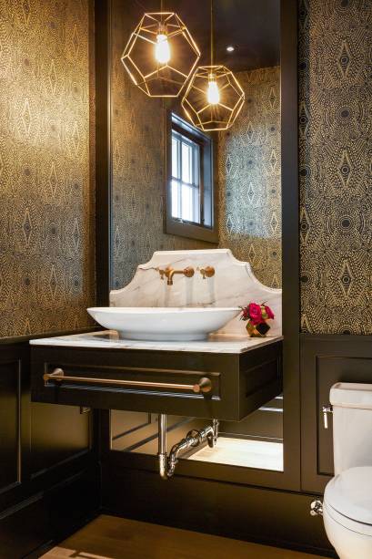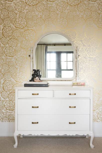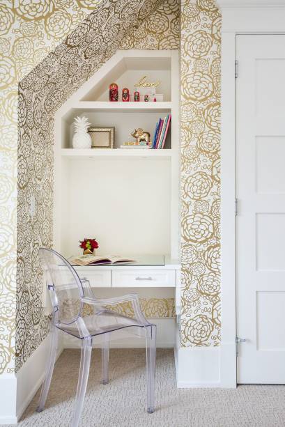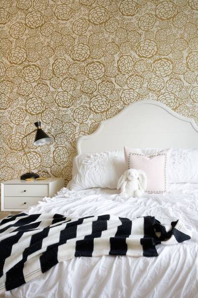 “Verificamos com nosso cliente, confirmamos que sua cor favorita era, de fato, rosa e depois pintamos todo o interior de sua casinha de boneca. Enquanto isso, o lindo papel de parede de flores metálicas douradas da Hygge & West une a sala ao resto da casa.”