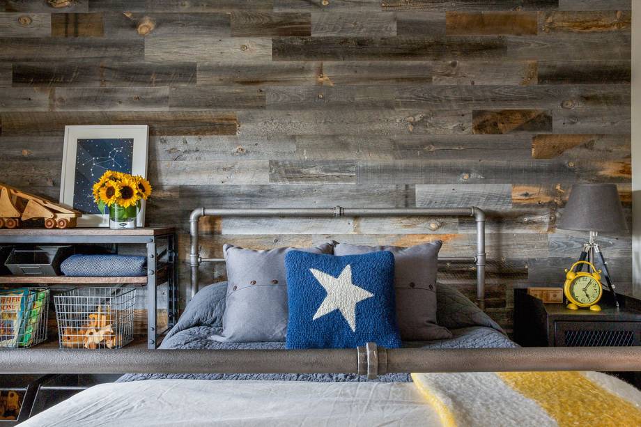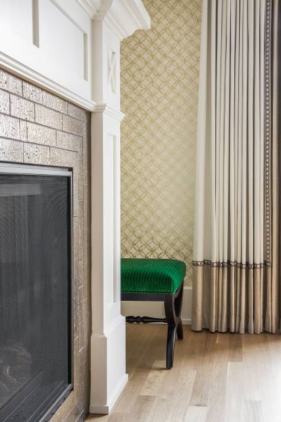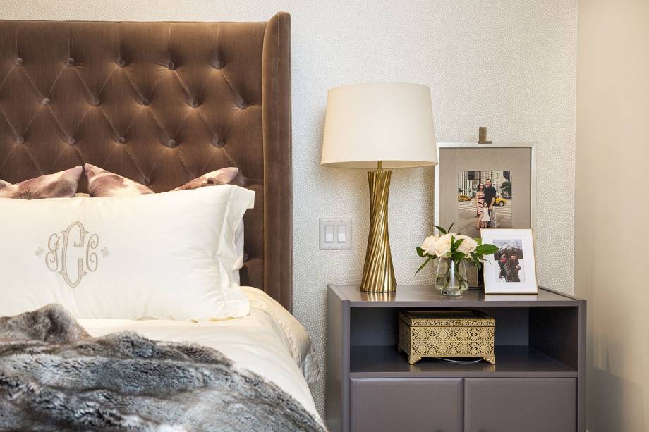 Já as lindas mesinhas de cabeceira foram feitas à mão pelo sogro da cliente! Observando atentamente o tratamento da parede, dá para notar o delicado e cintilante revestimento que foi escolhido para adicionar um pouco de brilho exclusivo a um espaço de outra forma suave, alinhando esta sala com os detalhes metálicos no piso principal.