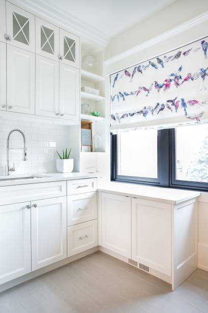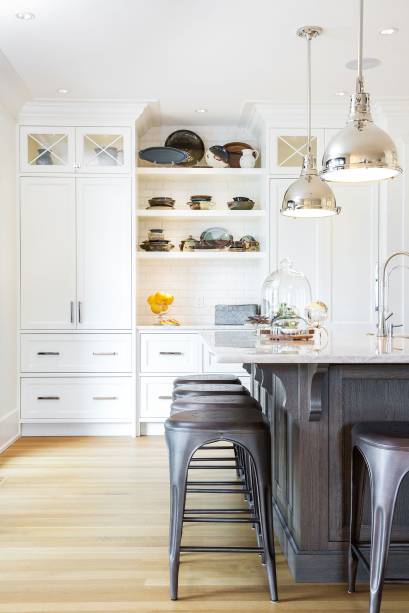 O design clássico da cozinha apresenta tons neutros em comparação com o restante do piso principal, com bancadas brancas e prateleiras abertas para apresentar a extraordinária coleção de cerâmica da cliente, de sua cidade natal em Saskatchewan.