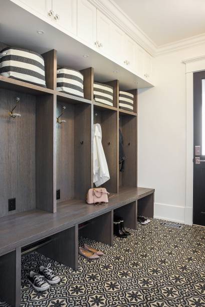 A mancha cinza na ilha da cozinha adiciona calor e contraste ao se conectar a outras marcenarias localizadas no piso principal, como o armazenamento embutido no mudroom.