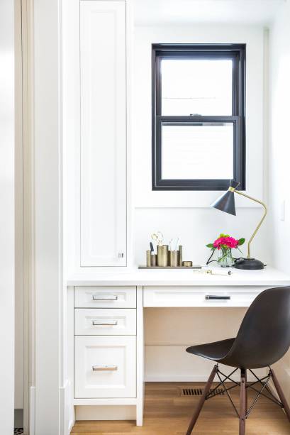Este recanto tornou-se uma das principais áreas de lazer da família para jogar e criar, com os armários ao redor abrigando todos os materiais de artesanato das crianças, para que nada esteja muito longe do alcance.