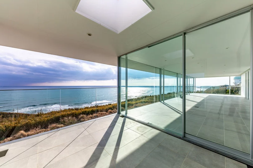 Esta estética reduzida, combinada com a abundância de vidraças, permite que a vista do oceano seja o centro das atenções, tornando a casa a moldura perfeita para a bela paisagem a sua frente.