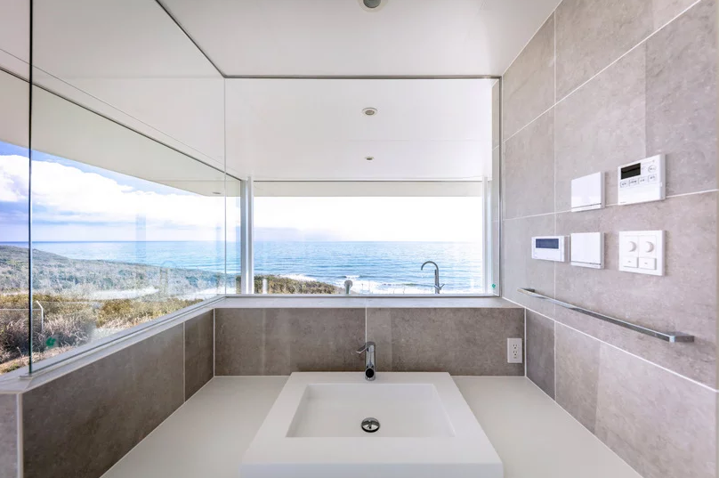 O lado norte do andar de cima, por sua vez, abriga um quarto principal, um quarto infantil, um banheiro e um closet com vista para os Alpes sulistas e para o Monte Fuji. Uma varanda contínua também envolve o bloco que se volta ao mar, permitindo que os moradores desfrutem do ambiente natural e da brisa marítima.