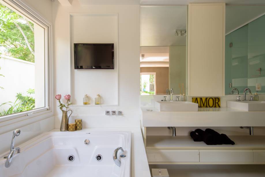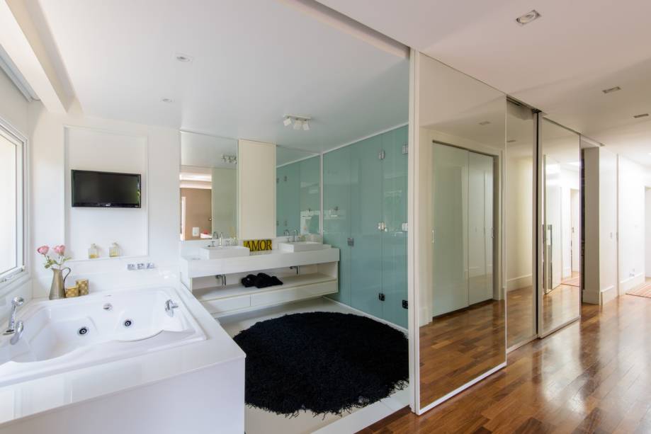 A área íntima da casa fica em um braço do L, que é o formato da construção. Os quartos principais são voltados para o jardim e se encontram com a piscina mais à frente. Na suíte master, um privilégio: o banheiro se integra totalmente ao quarto e tem as áreas de bacia e chuveiro fechadas por cabines de vidro opaco. A banheira e a área das pias e espelhos podem ou não ficar abertas para o dormitório.