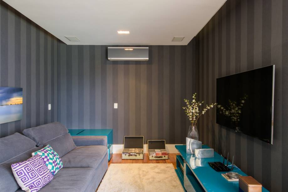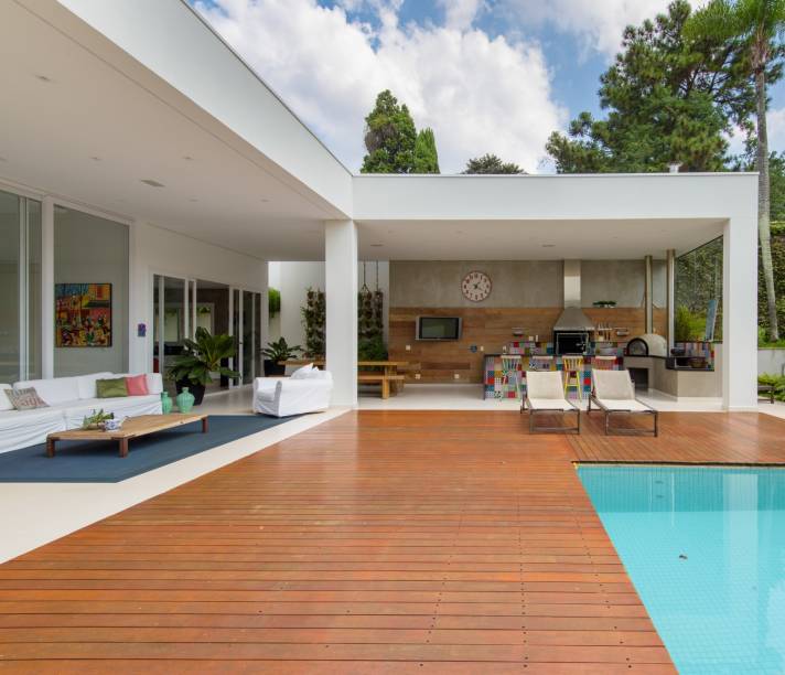 A churrasqueira, forno de pizza e forno a lenha foram projetados levando em conta os hábitos do morador, que é experiente com esse tipo de equipamento. Para trazer ainda mais aconchego e um ar descontraído ao espaço, a arquiteta escolheu cimento queimado para uma parte da parede, que foi revestida também de madeira. Os azulejos coloridos entram para completar o clima. A piscina, por sua vez, foi implantada paralelamente ao living e de frente para a área gourmet, trazendo água como um elemento principal da casa, o que contribui para a atmosfera de calma e tranquilidade que os clientes pediram.