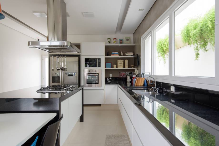 A cozinha se integra com a sala de jantar e com o terraço gourmet, por meio de grandes portas de correr. E, para dar continuidade, o cimento queimado também reveste parte das paredes. A marcenaria dos armários e portas internas são na cor branca e se contrastam com as bancadas de granito preto.