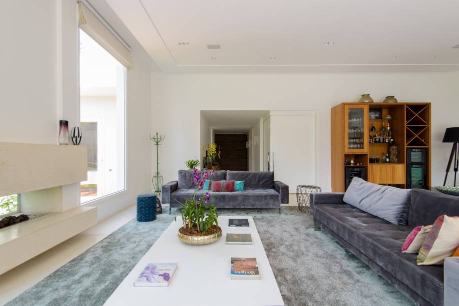 Já na parte interna, os ambientes são todas amplos, com grandes aberturas, que permitem máxima integração com o exterior da casa. No living, o pé-direito de 3,70 metros é valorizado pelas portas, que vão do piso ao teto, e permitem a abertura total do ambiente para o terraço. Não existem nem desníveis entre os pisos.
