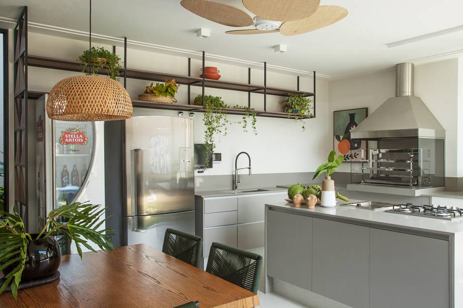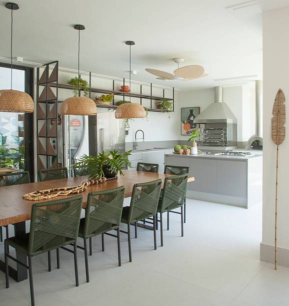 Mais ao lado esquerdo e bem próximo à piscina, estão o pergolado e o complexo com churrasqueira, forno de pizza e chapeira para a família. Para os dias frios, basta fechar as portas de correr para deixar tudo mais quentinho e, ao mesmo tempo, vivenciar a integração visual com o jardim externo. Ainda na área de lazer, a arquiteta criou um generoso espaço com mesa de madeira que acomoda até 12 pessoas.