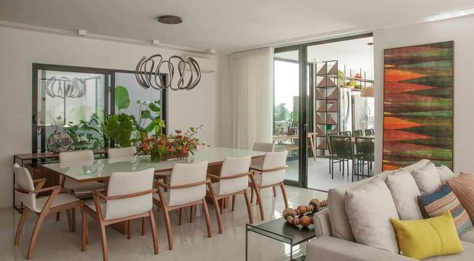 Integrado à sala de jantar, adega e cozinha, o living revela sua particularidade. Embora não haja separações físicas com os ambientes, móveis, tapetes e iluminação ajudam a delimitar bem cada espaço da sala e, por conta das portas pivotantes envidraçadas, living e a área de lazer também se conectam de forma sutil.