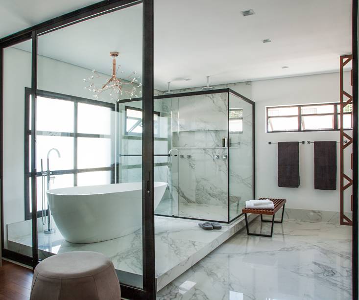 O piso elevado cria uma sensação de ambientes separados, deixando a área do banho em destaque. Já o painel de madeira vazado cria um espaço reservado para a bacia sanitária, transformando o ambiente no mais verdadeiro estilo ‘sala de banho’.