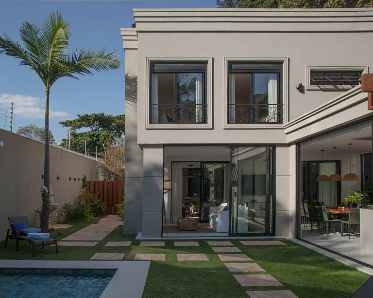 Logo após o jardim, a área de lazer dá continuidade à percepção de sossego. O projeto ganhou uma piscina na área que anteriormente era ocupada por uma edícula. Com a leveza de um gramado que contorna o seu perímetro, na parede a expressão da arte ao ar livre ganhou forma com o painel cerâmico colorido, em gradientes de azul, pintado à mão pelo artista mineiro Alexandre Mancini.