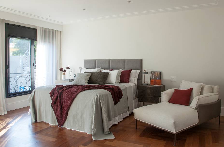 Com vista para a piscina e jardim, o quarto do casal possui grandes janelas que ocupam toda a extensão do quarto, valorizando a luminosidade e ventilação natural. Junto com o piso de taco de cumaru, que foi aplicado em todo o piso superior da casa, as cores claras e suaves nas paredes e cortinas propiciam a leveza que o ambiente pede.