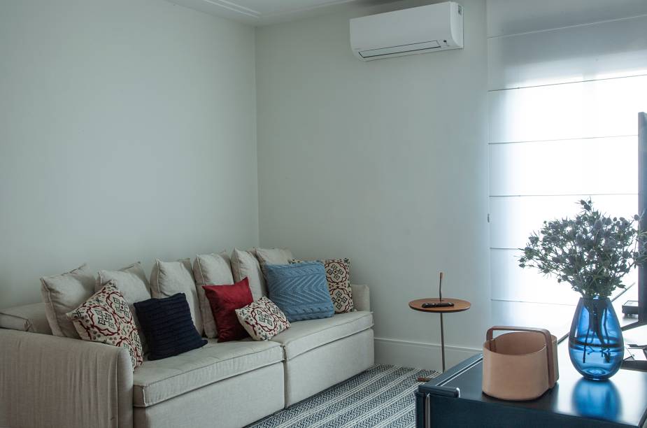 A sala íntima denota um mood sereno para as sessões de cinema em casa. O sofá reclinável é um convite para os moradores se espalharem e, para completar, ao lado do rack com a TV, um frigobar deixa as bebidas acessíveis e prontinhas para o consumo.