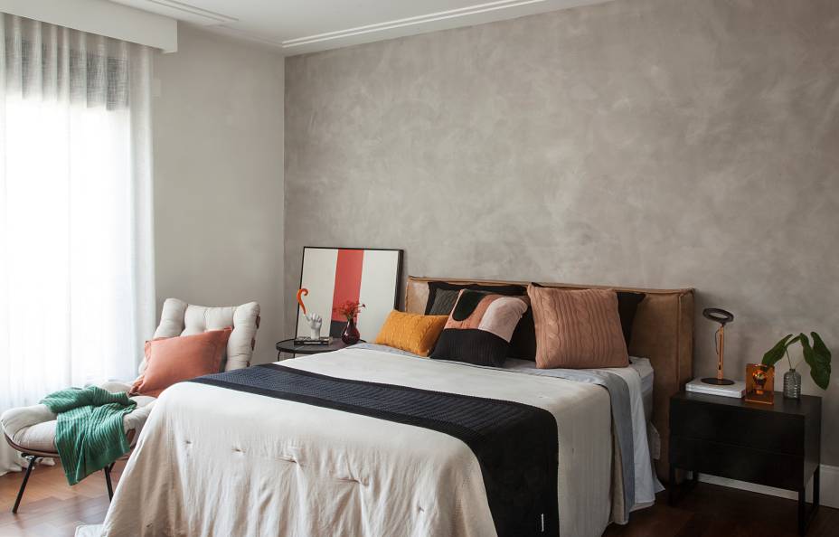 Contudo, o dormitório conta com uma particularidade. O closet é totalmente integrado ao banheiro e separado apenas por grandes portas de vidro e alumínio. “Desenhamos um mobiliário específico para cada item que os moradores desejavam guardar. Um detalhe para a comodidade deles é o pequeno pufe, que auxilia nas horas de calçar ou tirar um sapato”, explica a profissional.